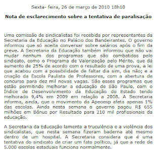 Bom, é sempre bom educar, então vamos mostrar um pouco da truculência dos sindicalistas e comprovar as nota de esclarecimento da secretaria, ok?