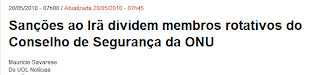 Caro Luiz,1) Brasil e Turquia "não foram até o Irã e convenceram". Isso tudo fez parte de um acerto coletivo para apenas dar mais tempo ao Irã. Pelo que se vê, ainda bem, não vai dar certo. Celso Amorim cometeu um ato falho. Primeiro falou em acordo, depois na entrevista coletiva falou em um texto para dar condições a novas negociações. Entregou que tudo aquilo é armação. Um acerto coletivo. A imprensa divulgou antes que não daria certo. Depois que o acordo deu certo mas não vale. Ela fez parte do acerto tb? Uma armação… sei… provar nem pensar né?!A credibilidade de um país se faz com o que ele promete e cumpre. o Irã nunca cumpre nada. Se ainda cumprisse os acordos, mereceria crédito. Só o Brasil dá crédito (por que será?) ao Irã. Aliás, Brasil, Líbano, Turquia, Uganda. O que o Brasil faz no meio desse bando, Imprença? Pense…To aqui pensando Luiz, para quê um papel assinado se você confia no país? Não seria por falta de credibilidade que os documentos são assinados? Quando você aluga uma casa assina contrato porque? Porque confiam em você? {{analogia, lembra?}}Outra coisa: os EUA não correram para apresentar as sanções… O texto estava pré-escrito. A lambança do Brasil só fez apressar a apresentação. Com apoio da França, Grã-Bretanha, Alemanha, Rússia e China. Luiz, eu até penso. Mas relendo sua frase vejo que vc, apesar de querer me desmentir, me deu razão… então… ok!Quando países tão diferentes estão do mesmo lado em um assunto é de se pensar… Ou não? Por que a França, que vai, até que enfim!!, desencalhar os Rafales para o Brasil, está do lado oposto do Brasil neste caso?? Pense, Imprença…Não sei, talvez porque faça parte do conselho permanente de segurança da ONU? Deve ser né?! O acordo tem muito mais a preocupação de demonstrar para a comunidade internacional que o conselho permanente de segurança estava errado ao dizer que não era possível negociar com o Irã do que qualquer outra coisa. É óbvio e esperado que o conselho queira manter sua posição de único a ser permanente e, para isso, vai negar sempre que possível que acordos com o Irã ou quem quer que seja o eleito da vez estejam dizendo.Ah, e o principal: de que vale um acordo entre três países????? Quantos países têm o mundo? Quantos países têm o Conselho de Segurança? Reparou a importância desse acordo de três países? Muito me surpreendeu a imprensa ter divulgado essa palhaçada. Caiu na real após 24 horas.O acordo, pensador, foi MEDIADO por 2 países, mas assinado pela AIEA, passa a valer para TODO O MUNDO. Gênio."Mas como fica o tal acordo, se os EUA estão querendo sanções a todo momento?" Essa pergunta parte de uma premissa absurda. Os EUA não estão "querendo sanções a todo momento". O Irã, que já disse querer destruir Israel, alimenta urânio e não permite fiscalização da ONU. Você quer negociar o quê com esse país?O Brasil também “alimenta o urânio” {{no meu tempo era enriquecer, mas td bem}} e também não permitiu a visita da ONU em nossas usinas, sabe porque gênio? Porque queremos destruir o mundo huahauhauahuahua. Ou pq tecnologia talvez seja algo importante para um país e dar de presente ao invés de negociá-la talvez não seja um bom negócio…