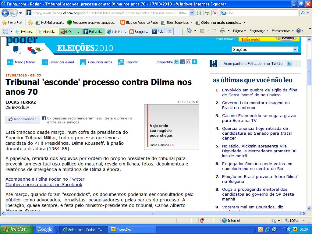 Não foi só isso, recentemente a mesma Folha de São Paulo requisitou junto ao TM {{Tribunal Militar}} a ficha de Dilma Roussef, com o intento de… é pois é, a Folha não diz porque gostaria de ver o material {{que estava disponível a qualquer um até março e deverá voltar à mesma situação após as eleições, palavras da própria Folha}}…
