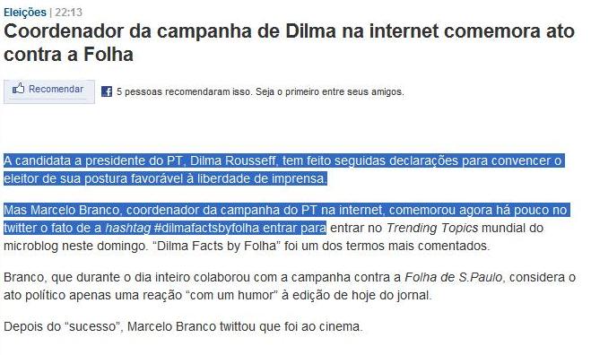 A crise no jornal foi tão grande que rendeu até uma brincadeira no Twitter, o #DilmaFactsByFolha , onde os usuários publicavam {{ainda publicam}} fatos que a Folha atribuiria à Dilma, se fosse possível.